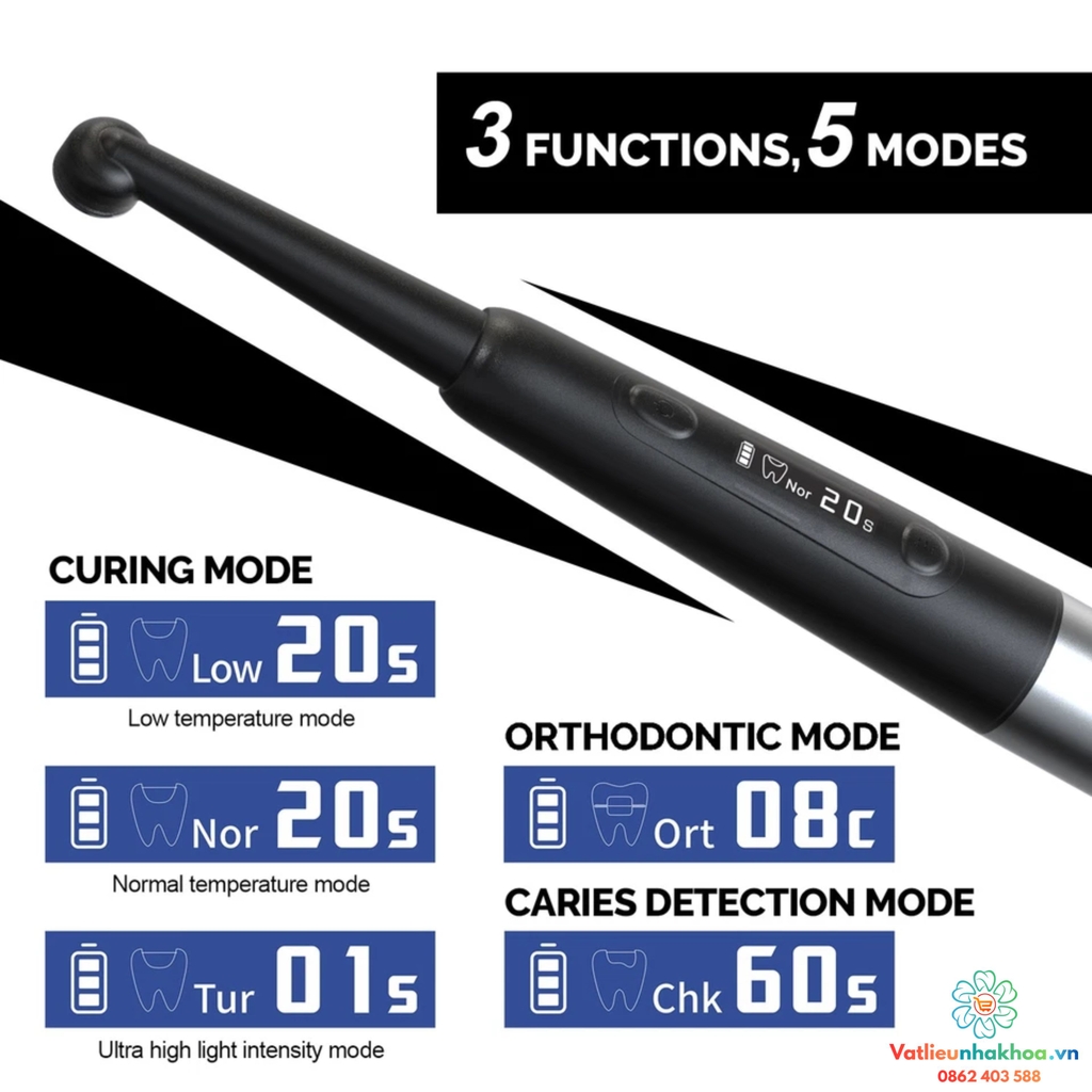 Ba chức năng đa năng: Bao gồm chế độ quang trùng hợp, chế độ chỉnh nha và chế độ phát hiện sâu răng, mang lại sự linh hoạt cao cho các ứng dụng khác nhau.