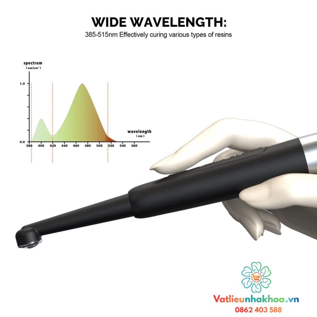 Quang phổ rộng (385nm-515nm): Đảm bảo khả năng làm cứng hiệu quả hầu hết các loại nhựa composite và vật liệu nha khoa khác có trên thị trường, mang lại hiệu quả làm cứng tuyệt vời.